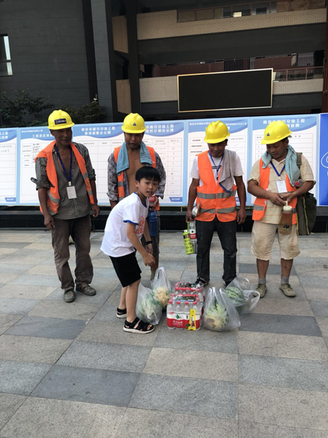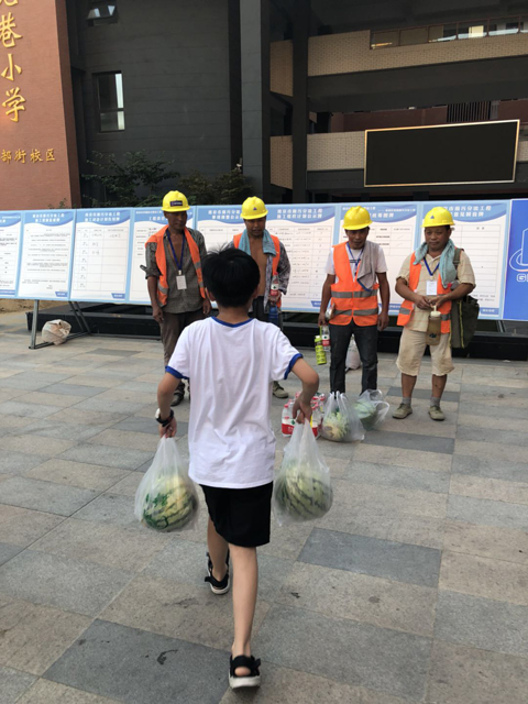唐博宇同学说:“叔叔们,你们辛苦了,快来吃点西瓜,喝点水降降温吧!”其中一位叔叔走过来说:“我们每天的工作就是头上晒,脚下烫。一天要喝上好几瓶水。”唐博宇同学看到他裸露在外的皮肤早已被烈日晒得发红,赶紧递过去一瓶矿泉水,叔叔接过水一饮而尽,说:“真是谢谢小朋友了,这么热的天还专门给我们送水和西瓜来,我们喝了你送来的爱心水,真的特别特别解渴啊!”