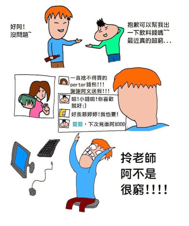 为了培养粉丝,洋葱首先建了一个脸书页面,并选在了愚人节发布了自己的第一部吐槽风格的漫画作品--他有一个小气吝啬的朋友,平时吃饭、喝饮料都问朋友借钱,大家就以为他家境贫穷,所以对他慷慨解囊。可是,后来洋葱却发现穷小子给一个女生买了很贵的蛋糕……