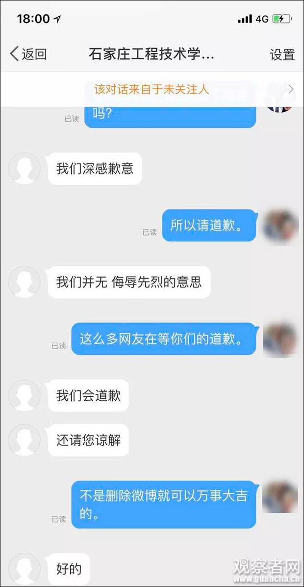 另有人询问如何处理发微博的人,名为“石家庄工程技术学校团委”的对话方表示,“这次的事情是一个意外,我们下次会注意。在这里我们再次向广大网友以及烈士们道歉,这件事我们还要商议决定。”
