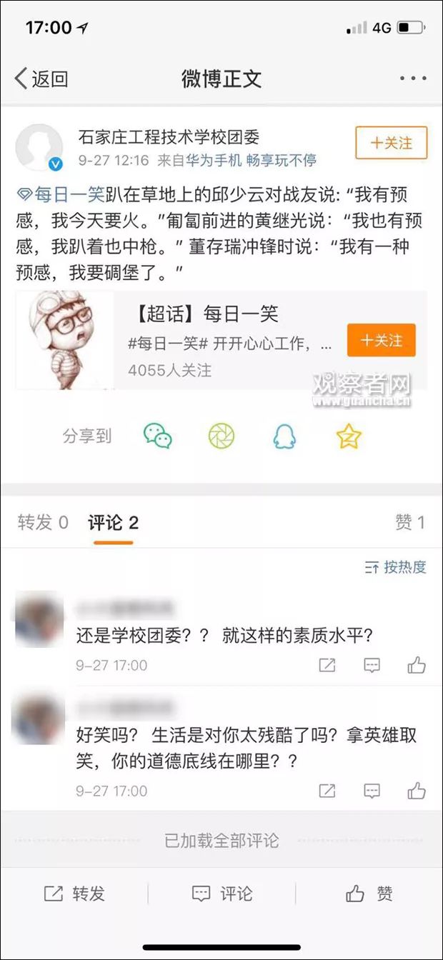 今天(27日),一条同时恶搞了邱少云、黄继光、董存瑞3位烈士的微博受到众多网友声讨。截图显示,微博发布者是石家庄一所学校的官方微博。