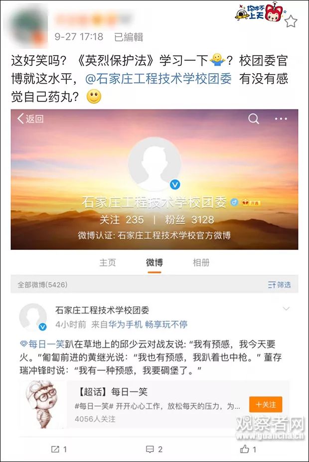 27日下午,某微博军事博主愤怒地问道,“这好笑吗?《英烈保护法》学习一下?”受到质疑的正是一张显示为@石家庄工程技术学校团委 微博内容的截图,该账号被认证为“石家庄工程技术学校官方微博”。