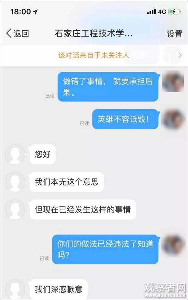 数张对话截图显示,学校回应称,“我们本无这个意思,但现在已经发生这样的事情,我们深感歉意,我们并无侮辱先烈的意思。我们会道歉,还请您谅解。”