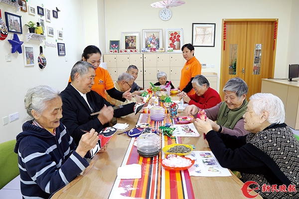图说:今天上午,八位老人正在嘉兴路街道市民驿站老年人日间照护中心做手工。新民晚报记者 王凯 摄