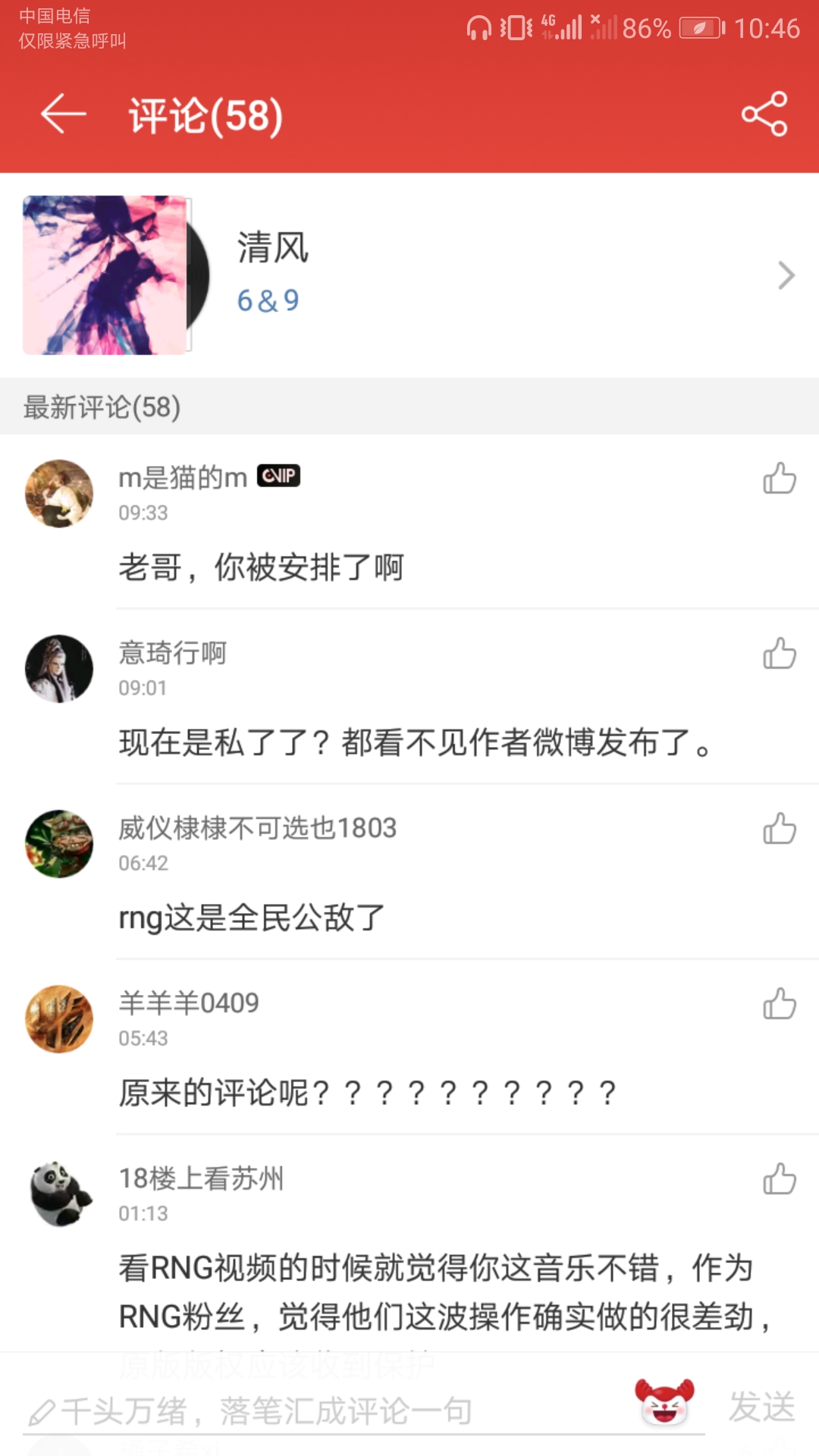 原来在这个视频中使用了一首网易云里面的曲子,它的名字叫《清风》,但是在没有任何授权的情况下,RNG使用了。