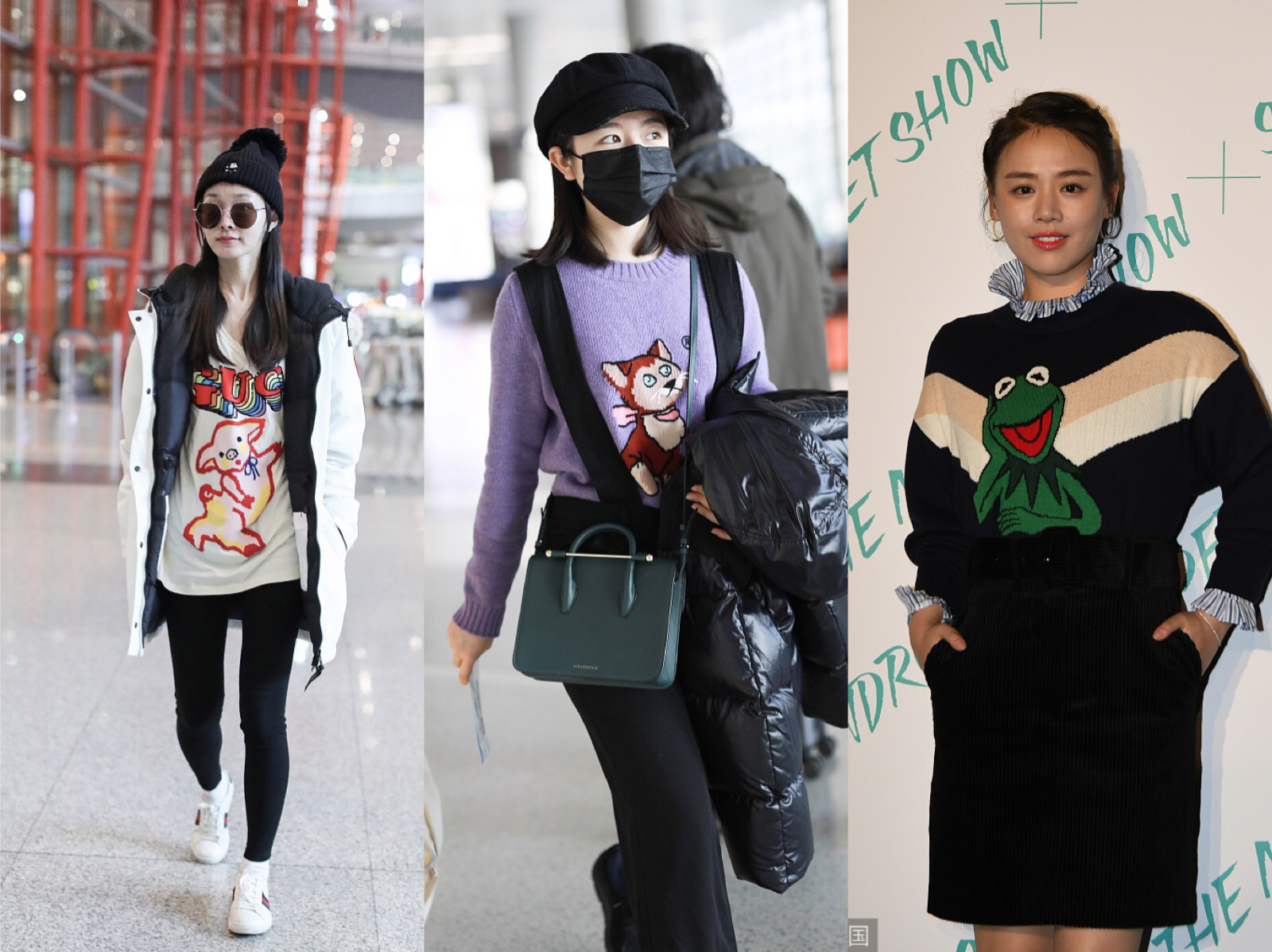 本季,卡通毛衣不再是孩子们的专属,很多大牌都推出了卡通毛衣,款式复古、配色亮眼,活泼可爱。宋轶的Gucci毛衣是猪年的“贺岁款”,灵动又清新。李兰迪的这款淡紫色毛衣出自Miu Miu,俏皮的图案为她增色不少。而马思纯这件毛衣上的卡通图案则是科米蛙,马思纯用它搭配小黑裙与立领荷叶边衬衣,让整体造型变得精致、淑女起来。