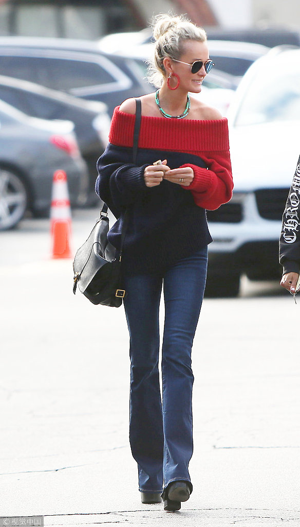 莱蒂西娅•哈里代的这件拼接毛衣款式更时髦,红色与藏蓝色的拼接自然协调,一字肩的设计可以巧妙露出肩膀与锁骨,正适合春季。