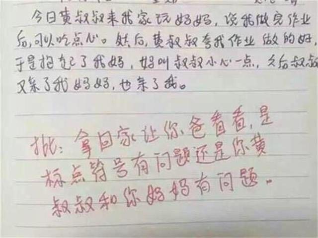 这个实在是笑死人了,又是一个标点符号引发的血案。老师批语拿回家给你爸爸看,是标点符号有问题还是你黄叔叔和妈妈有问题?