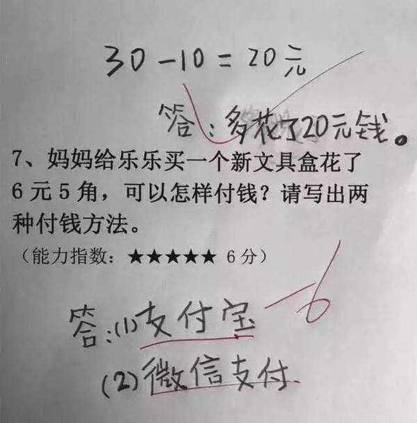 这个小朋友实在是机智到不行,也非常贴合实际。题目让写出两种付钱的方式,第1种是支付宝,第2种是微信。小编确实也觉得这样的回答完全没毛病啊!