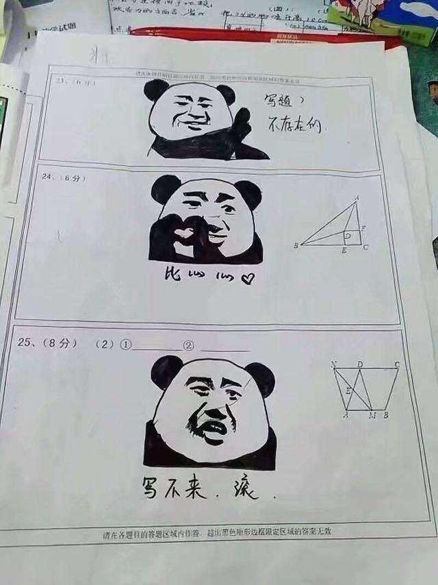 从这图来看,这是一个数学答题卡,这位同学画了三个表情包。“写题,不存在的”“比心心”“写不来,滚”。说实话这个画得确实不错,跟手机上发出来的表情包没有差别。来参加数学考试确实是屈才了,应该去当一名大画家。