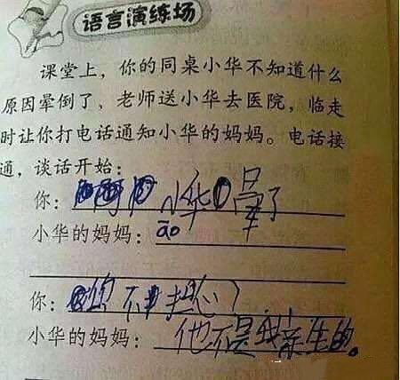 这是一道情景模拟题,模拟小华晕倒后“我”和小华妈妈的对话:“小华晕倒了”,“噢”,“你不担心?”,“他不是我亲生的”。这个答案脑洞实属大开。