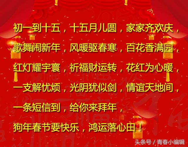 四:狗年当空照,幸福对你笑,财运点点头,福运扭扭腰,开心拍拍脸,顺利跺跺脚,平安握握手,吉祥微微笑。新年快乐哦!