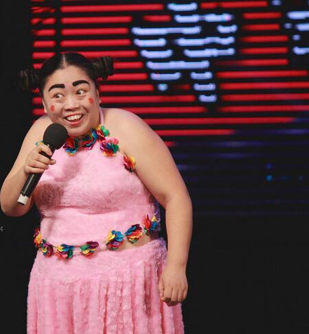 小抓髻、花裙子、粗眉毛、两侧脸蛋子上各一个大红点,这是小黄飞的标志性装扮。小黄飞的演出内容大体是这样的--自己或者和搭档站在台上讲笑话、自黑、互损、说荤段子,要不就主动出击,强行和某个台下的观众互动,内容多半都带点颜色。